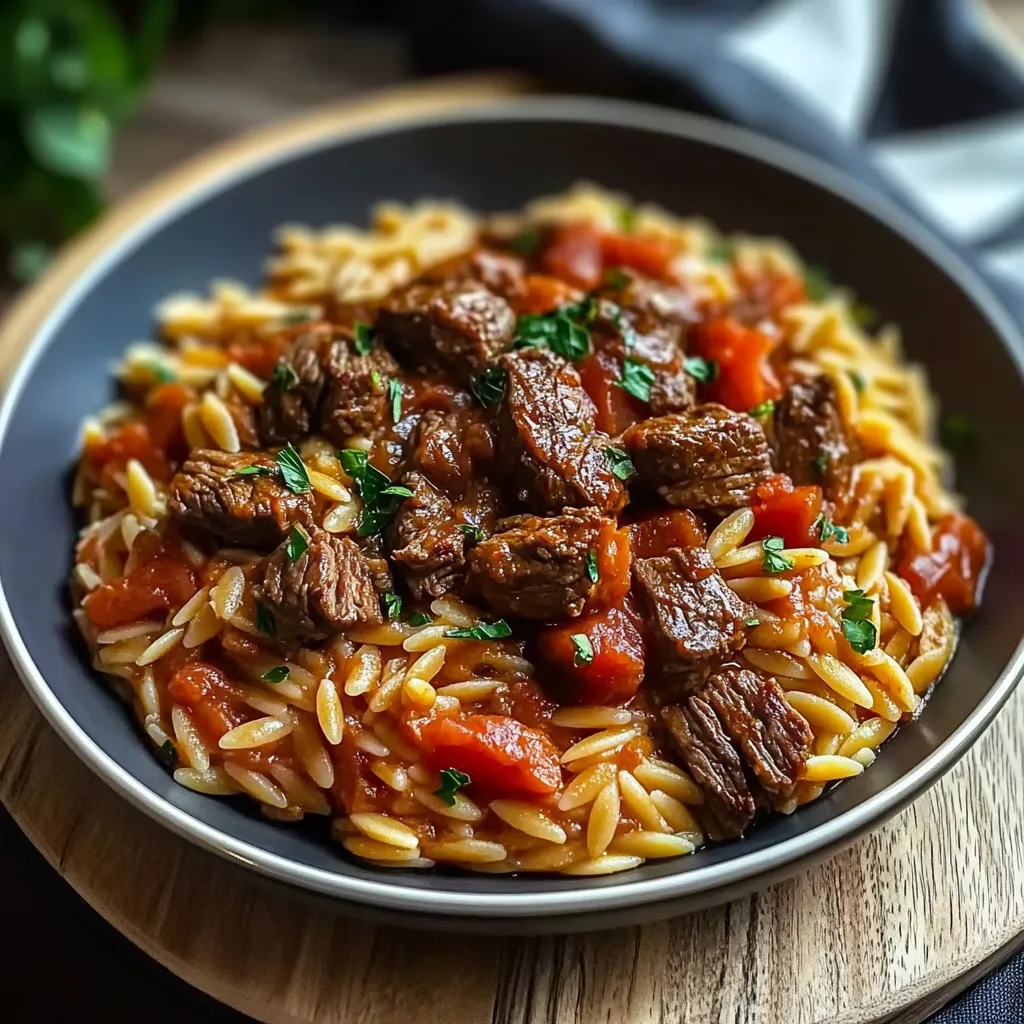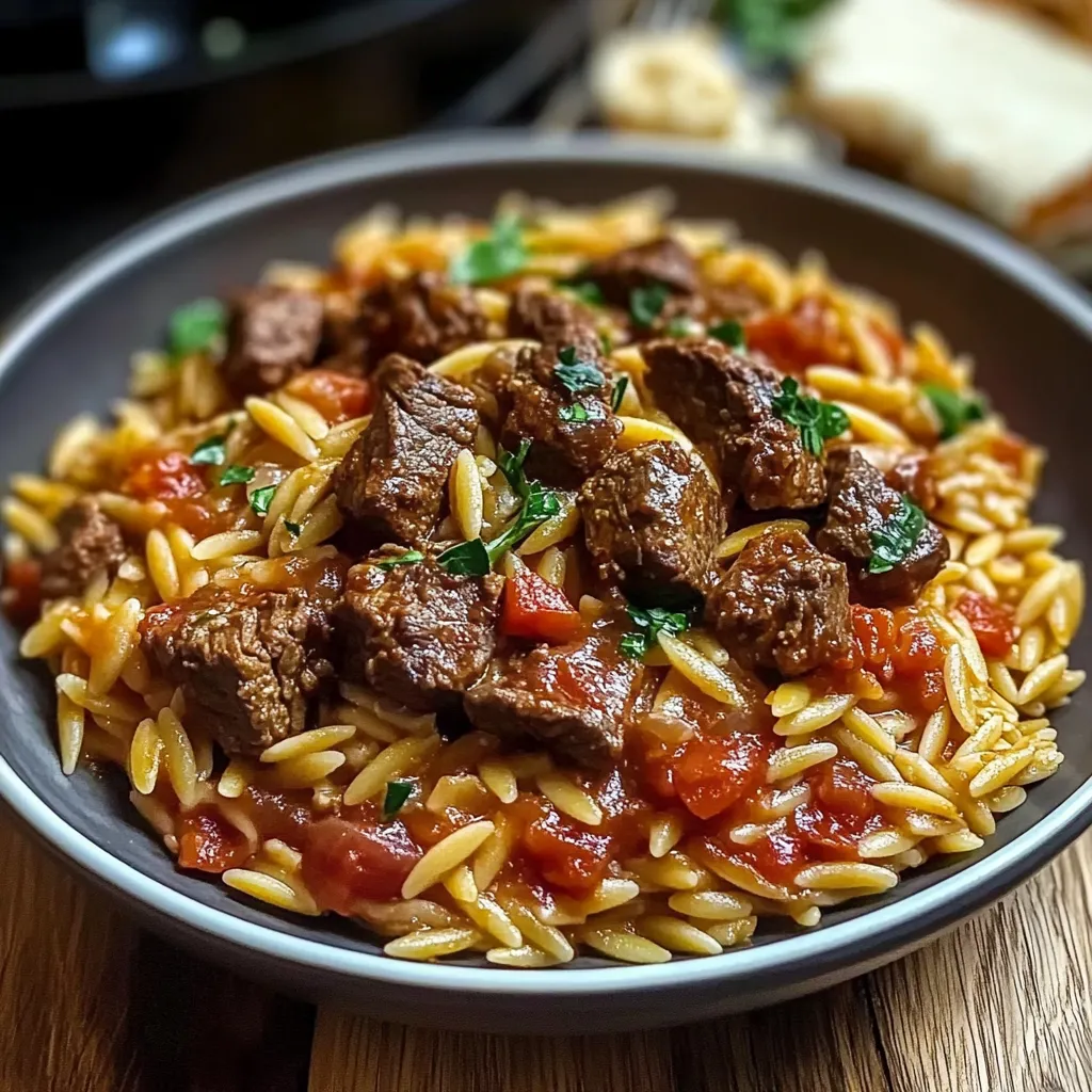 A delightful Greek dish featuring tender beef and orzo pasta in a savory, rich sauce, perfect for family dinners or impressing guests.