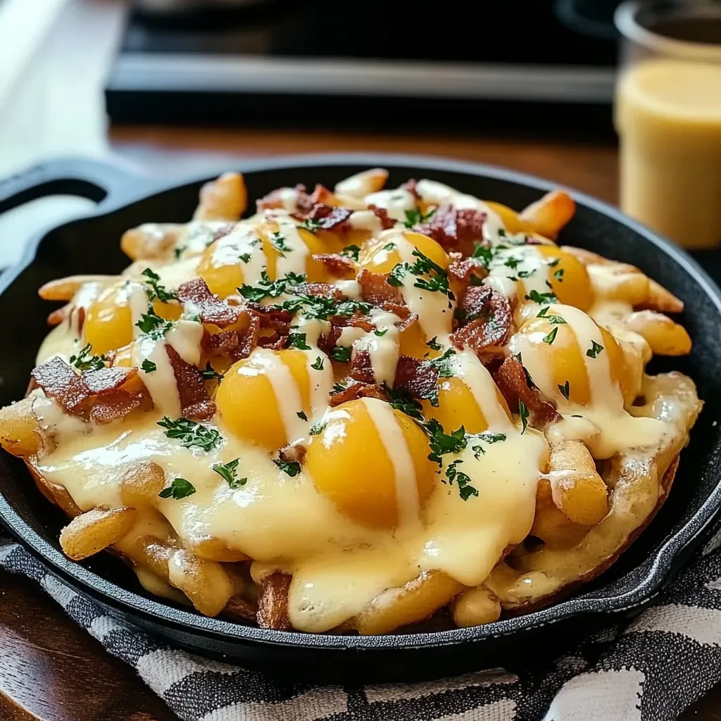 • Step 4: Once fries are crispy, layer them in a serving dish. Sprinkle cheese curds over fries, place poached eggs on top, and drizzle with hollandaise sauce. Garnish with chives or green onions if desired.