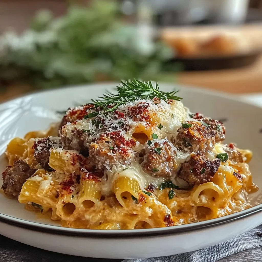 Keywords: pasta bake, creamy sausage pasta, Italian recipe, easy dinners, weeknight meals
