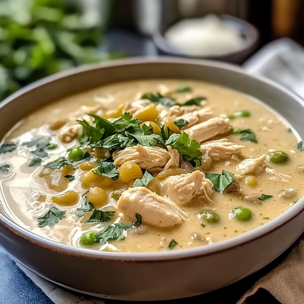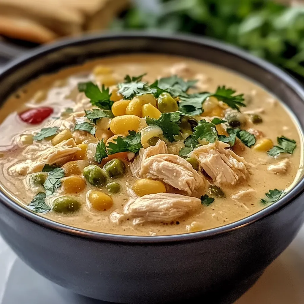 A delicious and creamy twist on traditional chili, featuring tender chicken, gentle spices, and a luxurious texture from cream cheese.