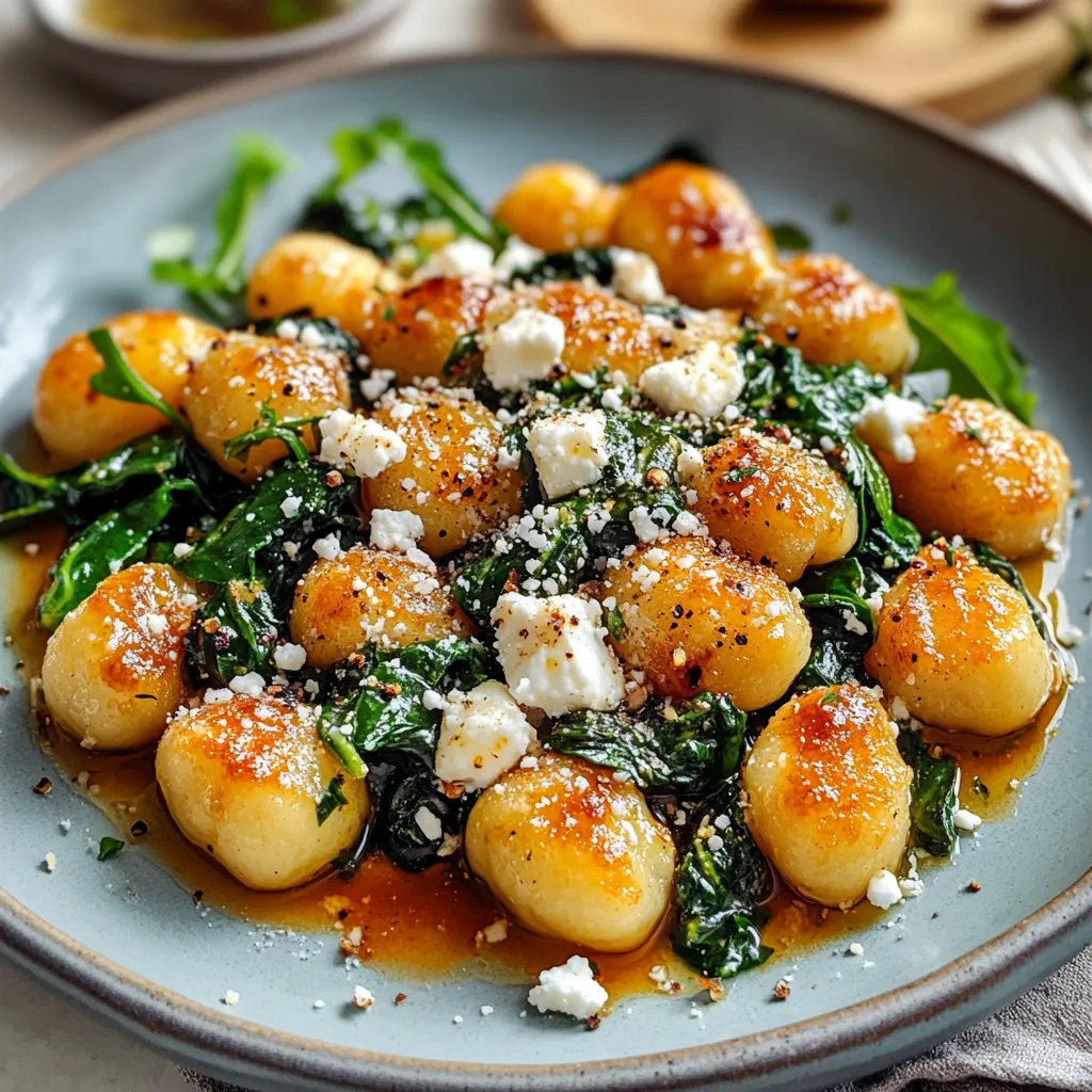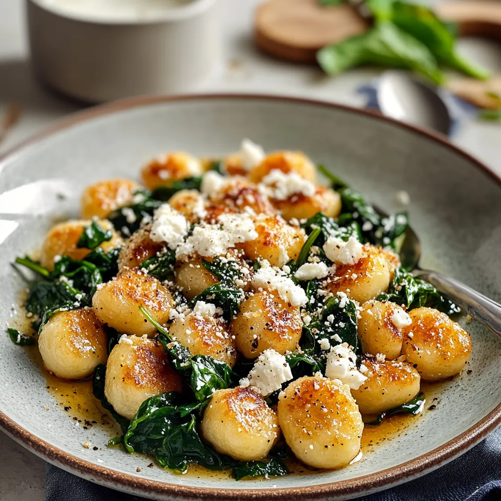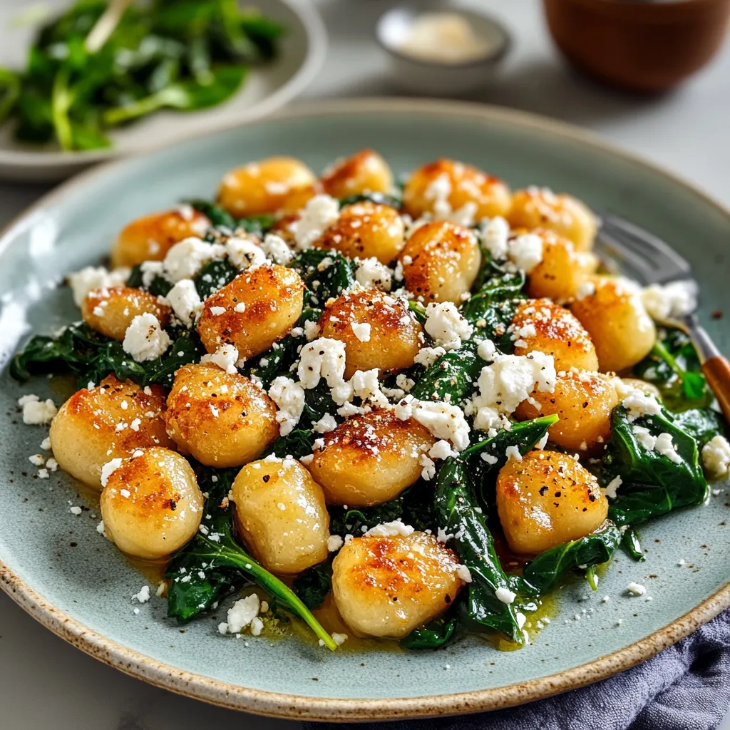 Savor crispy gnocchi with spinach feta a nostalgic dish bringing childhood flavors alive in every delightful bite Experience this tasty memory
