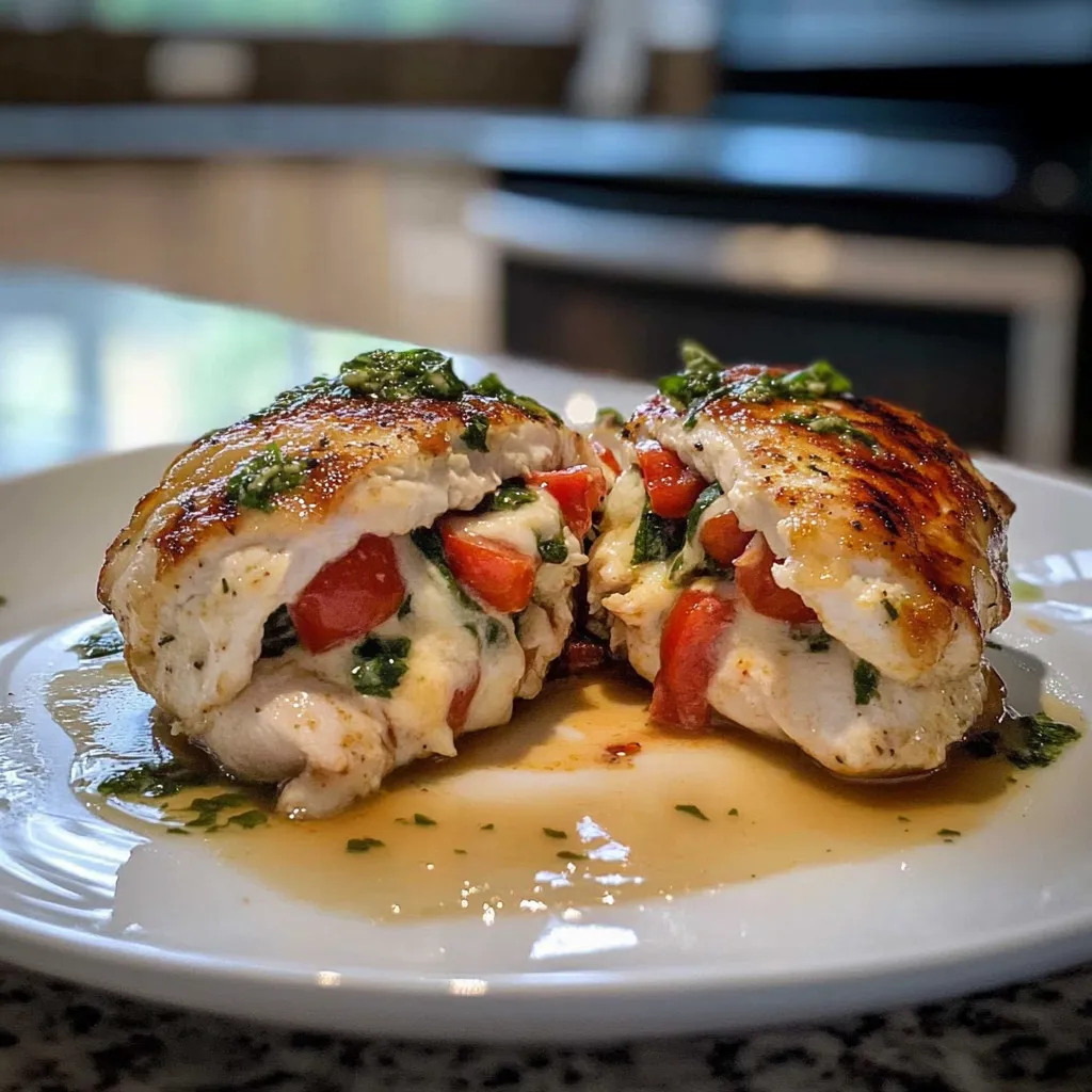 A quick and comforting dish that combines fresh mozzarella, juicy tomatoes, and fragrant basil all stuffed into chicken breasts for a delightful weeknight dinner.