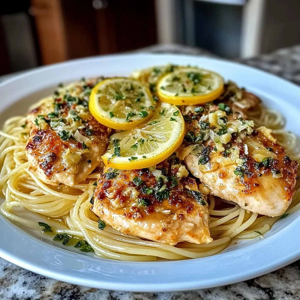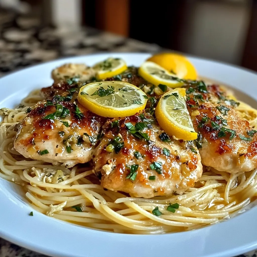 Delicious Lemon Artichoke Chicken Piccata over Angel Hair Pasta