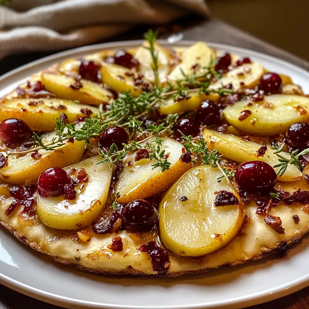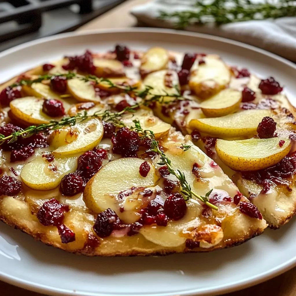 This Pear, Brie, and Cranberry Flatbread is a gourmet dish that combines sweet fruits with rich cheeses, resulting in a perfect appetizer or snack.