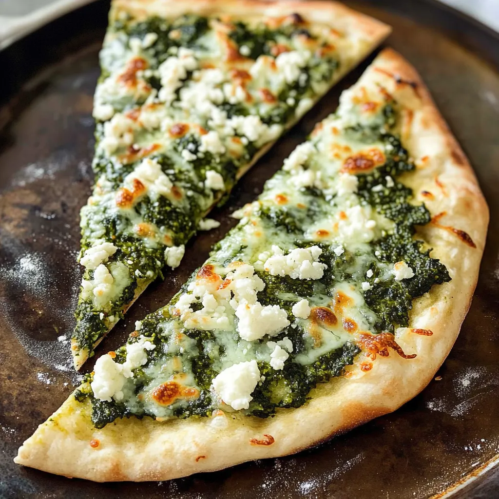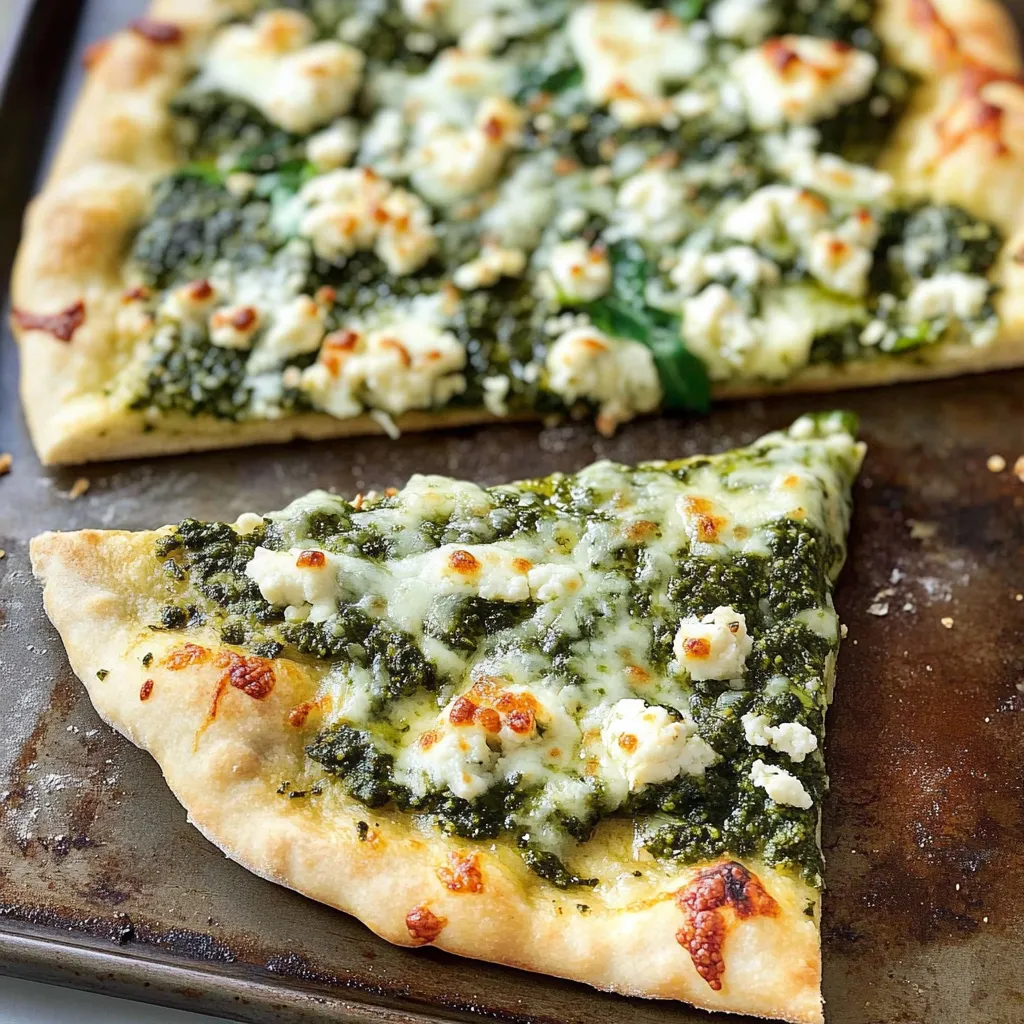 A delightful twist on a classic pizza featuring a thin, crispy flatbread topped with vibrant green pesto, fresh spinach, and a sprinkle of cheese, perfect for weeknight dinners.