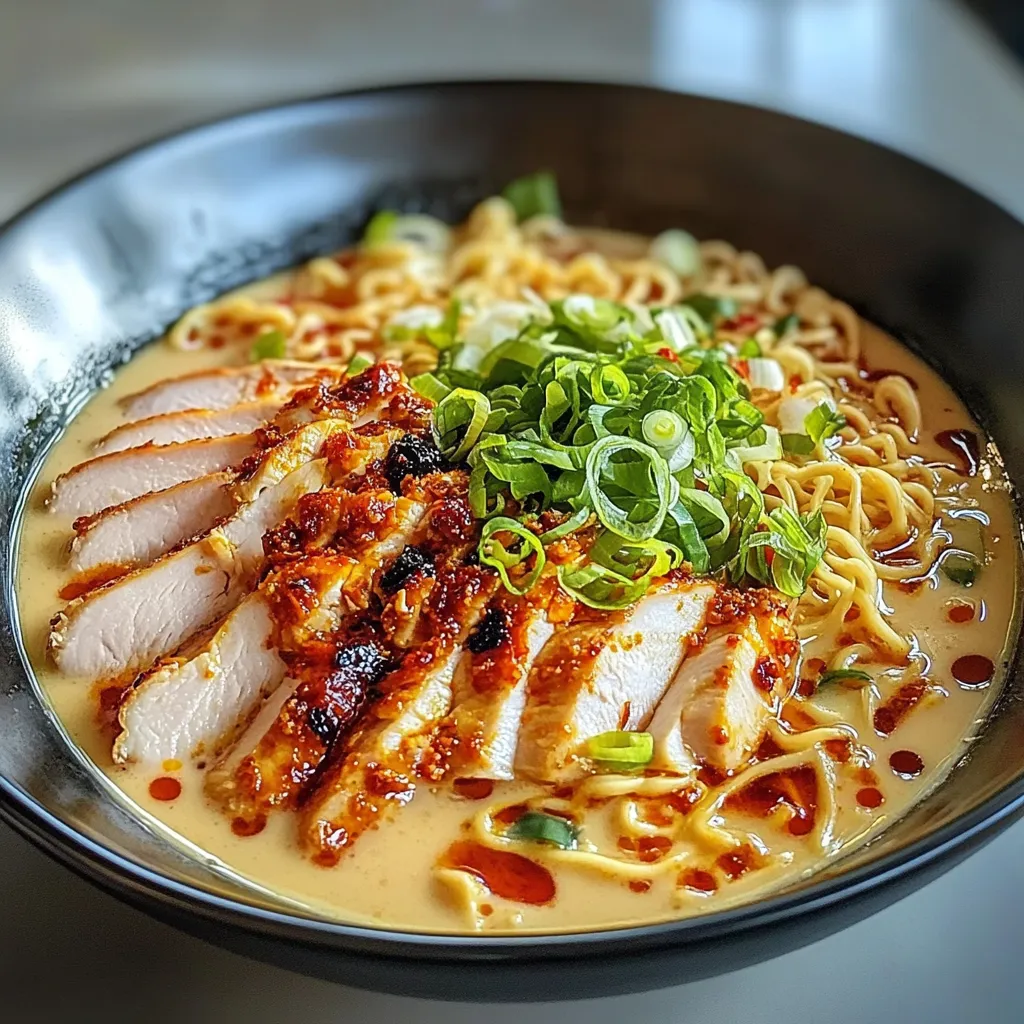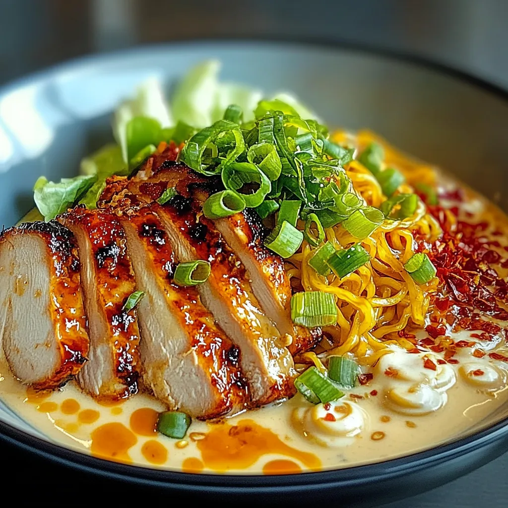 Elevate your ramen experience with this Spicy Fiery Chicken Ramen featuring a rich creamy garlic sauce.